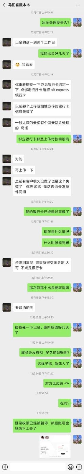 我2020年八月份开始在马汇交易,爆仓过一次,后来又重新入金交易,盈利了。12月14日我申请了出金盈利部分27493美金,但是过了几天出金都是待处理,询问客服说没看到我的出金,让我取消后重新出金。12月18日我重新出金,但是几天之后还是没动静,我联系微信上的客服,一直都没有回应,联系在线客服说让我发邮件询问,12月23日发的邮件到现在都没有回复。12月28日我发现我的MT4账号被禁用了,尝试登陆后台显示登陆权限被暂停。现在人都联系不上,也没人通知我到底怎么回事,我的本金和盈利一共47493.03美金都还在平台里,我也不知道怎么能把钱取出来,希望你们能帮我把钱要回来。