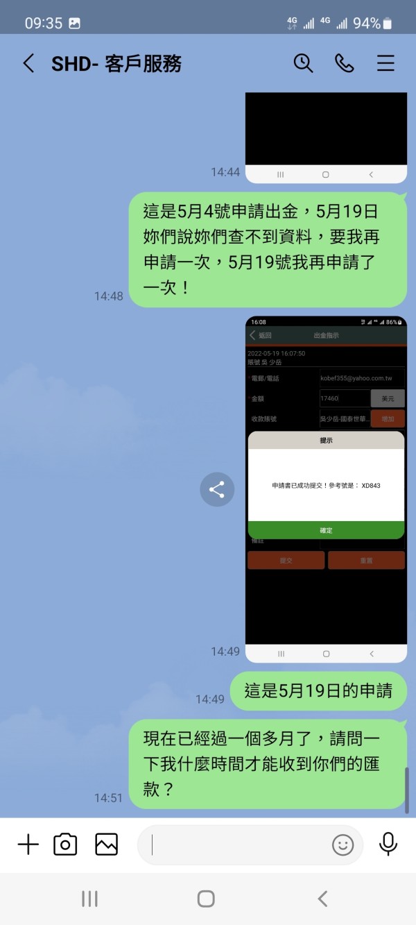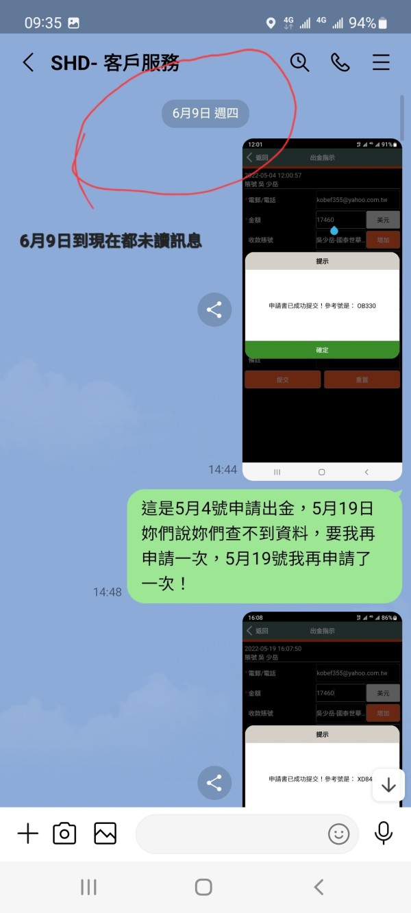 5月4日申請出金後5月19日未收到匯款請他們查一下,結果說沒有差到請我再重新申請一次,到如今還是沒收到匯款,6月9日發訊息給客服,客服居然到現在(6月13日)也未讀訊息!這不是客服專線嗎?不應該是這樣。