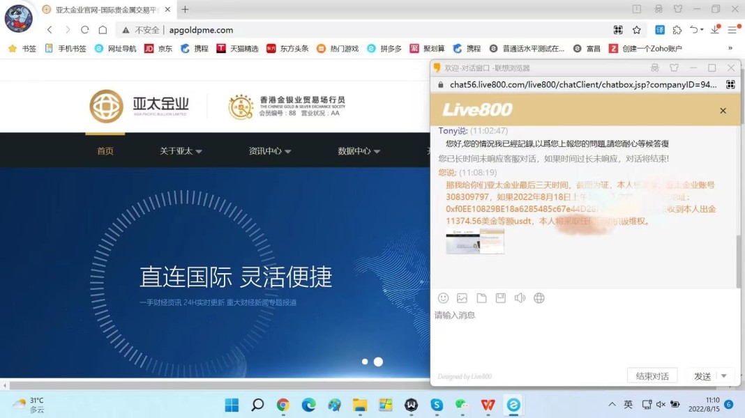 本人在亚太金业的账号是308309797,于2022年5月9日和10日两天总共入金94.96+9402.18美金,交易期间有赢有亏,经过一番交易之后小有盈利,本人最终于2022年7月12日提交11374.5美金全部出金,在提交出金之后,MT4里面的钱就被直接扣掉了,出金后台状态一直是审核中,期间也有找过无数遍客服,但是客服的回复都是千篇一律,让我耐心等待,发邮件过去也是毫无回复,于是一直耐心等到今天,已经过去两个多月了,资金都没有到账,只能开始申请维权,这家是黑平台吗?
