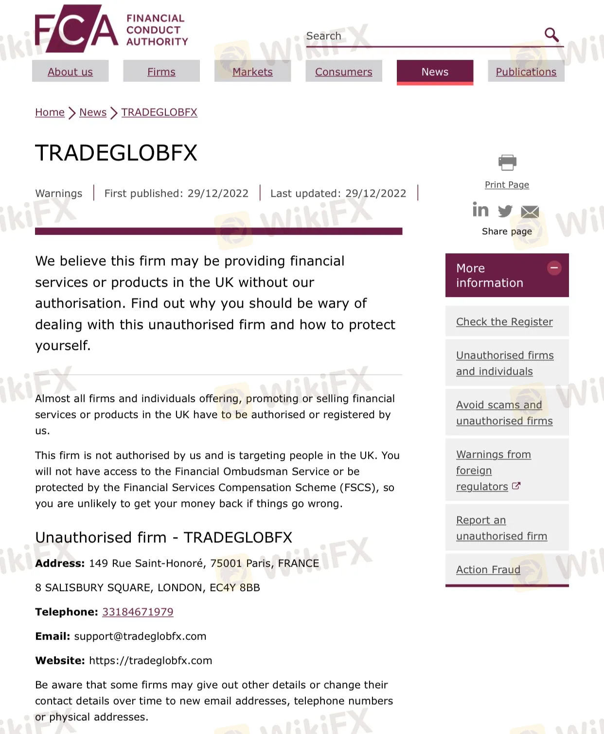 وفقًا لـ FCA ، لا يحق للوسيط تقديم خدمات مالية. في الواقع ، صرحت هيئة السلوك المالي (FCA) أنه ليس وسيط مرخص ، وبالتالي لن تحصل على أي حماية. تثبت مثل هذه التحذيرات بشكل شبه مؤكد أن شركة ما تقوم بنوع من عمليات الاحتيال - لذا امتنع عن اختيار الشركات المشبوهة التي حظيت بتقييم سلبي من السلطات المالية ذات السمعة الطيبة مثل FCA. الطريقة الوحيدة للتأكد من أن استثمارك في أيد أمينة وأنك ستعامل بإنصاف ووفقًا لجميع القوانين هي اللجوء إلى وسيط شرعي ومرخص.
