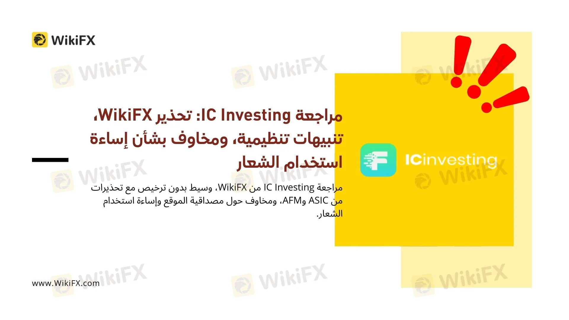 تشير المعلومات المتاحة إلى أن IC Investing لا تمتلك أي ترخيص تنظيمي صالح، وقد صدرت بحقها تحذيرات رسمية من جهات رقابية، كما أنها مرتبطة بممارسات تضليلية في هوية موقعها الإلكتروني، بما في ذلك الاستخدام غير المصرح به لشعار تطبيق تابع لطرف ثالث.