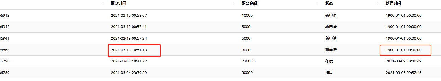 Beantragen Sie die Auszahlung am 4. März 2021. Die Verantwortlichen sagten, der Betrag sei groß und baten mich, in geringem Umfang abzuheben. (wie 2.000 oder 3.000). Ich glaubte, was sie sagte und sie stornierte meine Bewerbung. Aber sie haben meinen Antrag immer noch nicht bearbeitet, nachdem ich einen Widerruf mit geringem Betrag beantragt habe! Die angezeigte Bearbeitungszeit ist der 1. Januar 1990 !!! Öffne deine Augen!!!