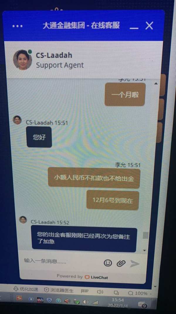 从10月份开始就不给我们出金,然后11底说可以申请1000美金以下的小额人民币出金,本人12月6号申请的。到现在1月4号,都还没有扣款。更不要说打款啦。