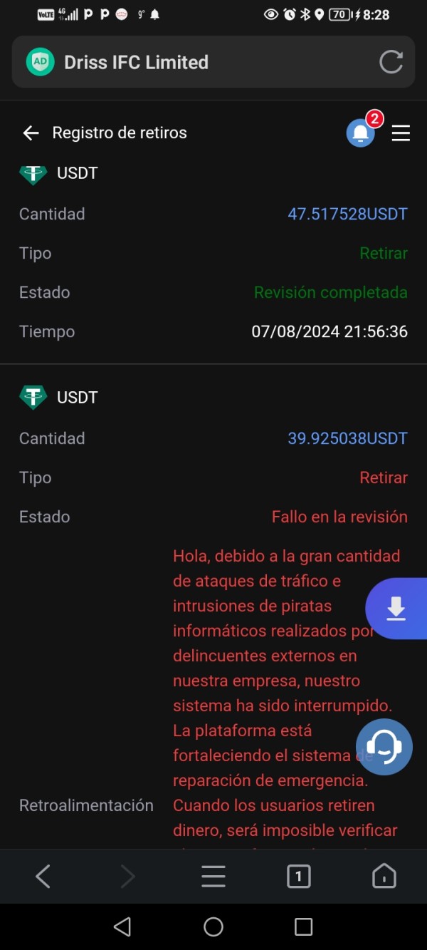 primero rechazó el retiro. luego aparece confirmado. pero no llegó a la billetera