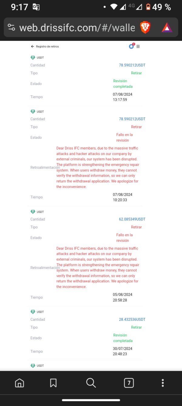hize un retiro en la plataforma de Driss ifc limited,aparece revision confirmada, pero no llegan los fondos a mi billetera. hace una semana estaba presentando dificultades en las operaciones y la explicación que dieron fue ataques de piratas informáticos.