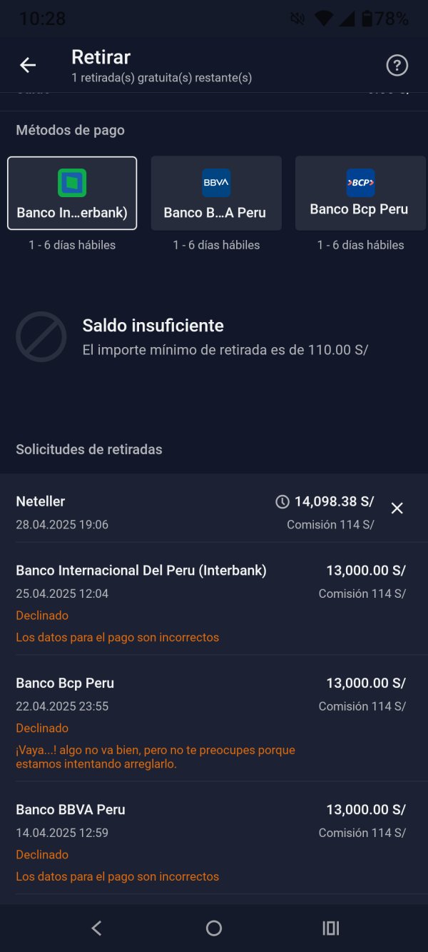 No me ofrece una solución clara respecto al retiro de las ganancias obtenidas en mis operaciones. He solicitado el retiro de mis fondos en cuatro ocasiones, y las tres primeras fueron anuladas sin motivo aparente. Mi cuenta se encuentra completamente verificada, y he enviado todos los documentos adicionales que solicitaron vía correo electrónico. A pesar de ello, continúan cancelando mis solicitudes de retiro. Mi último intento fue a través de Neteller. Luego de haber pasado una semana desde que inicié el proceso y tras haberme comunicado diariamente por correo electrónico con el equipo de soporte desde que vencieron los tres días hábiles estipulados para este tipo de retiro me solicitaron capturas de mi cuenta y datos personales, los cuales también fueron enviados y confirmados por su equipo. Según me informaron, estos documentos fueron aprobados por el departamento de pagos y seg. Sin embargo, hasta el día de hoy, la solicitud parece congelada. Ya pasaron 2 semanas y no responden.