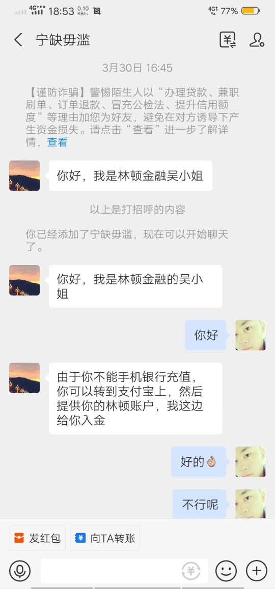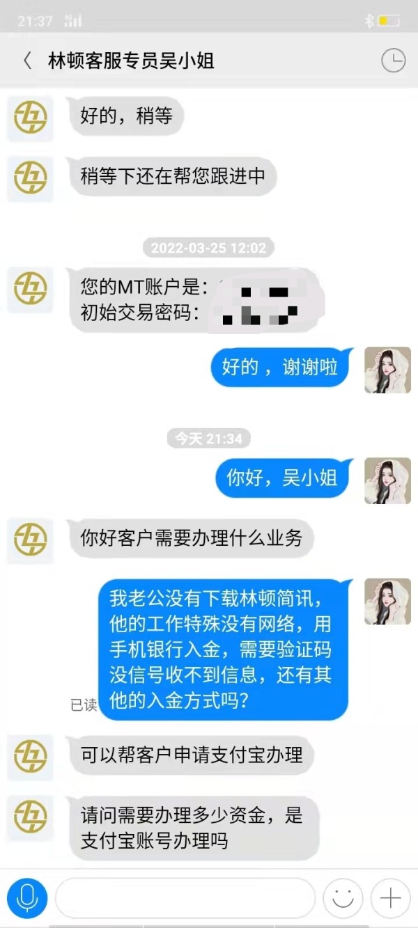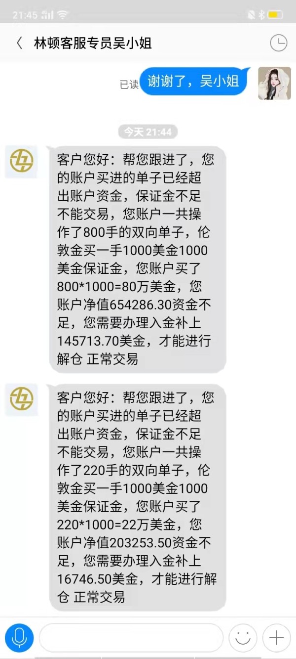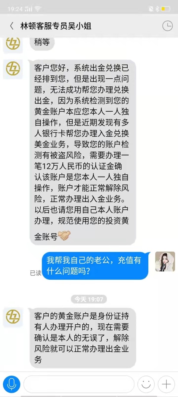 因为本人工作原因没办法使用手机银行入金,这个情况也是给林顿金融的吴小姐讲过的她也知道,每次入金前也都联系她了,后期入金都是按照她方法进行的;因为钱少的原因账户里面的一直没有取过,直到这周一四月四号黄总监操作了一下结果导致锁仓,需要16746.50美金解仓,我补足解仓金后又说我账户有被盗的风险需要交12万的保证金才能取钱,我不明白我一直按照她们的方法入的金造成的风险为什么需要我来承担,我也不知道这个保证金交了钱还能不能取出来,每次都是交完钱后又有新问题,这就像个无底洞一直往里投钱也见不到底,我现在已经没有钱再往里面投了还欠了别人很多钱,每天都是催债的消息没有办法了,只能在这上面投诉和报警寻求一点点的希望!!!