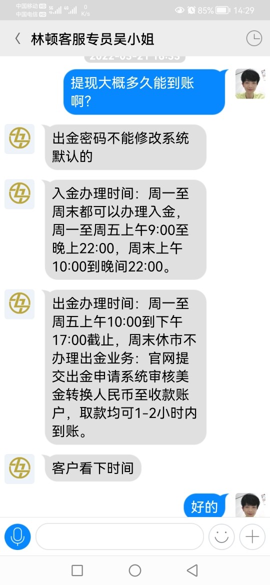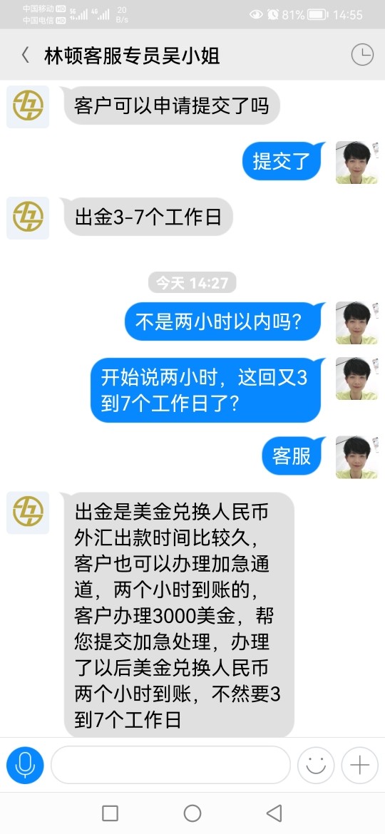 林顿金融黑平台,开始说出金两小时之内到账,现在又说3到7个工作日到账了,朋友一定要远离,避免资金损失