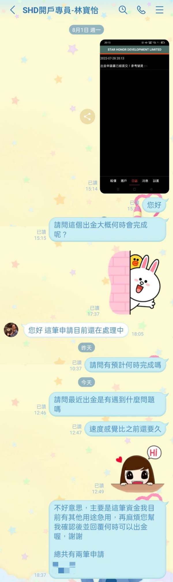 從7/28申請出金到現在都沒有消息,詢問客服人員也愛理不理,問何時可以完成出金也只回覆處理中...