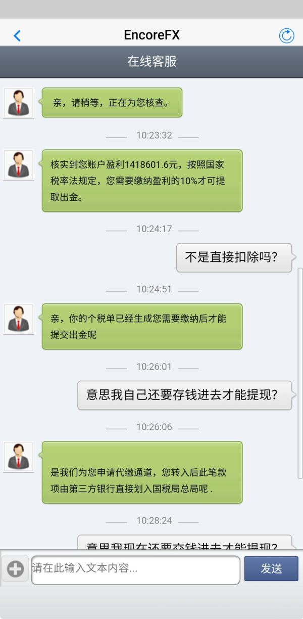 提现24小时没有到账 说要交百分之十的税才能提 感觉这是一个骗局 这个平台是EncoreFX