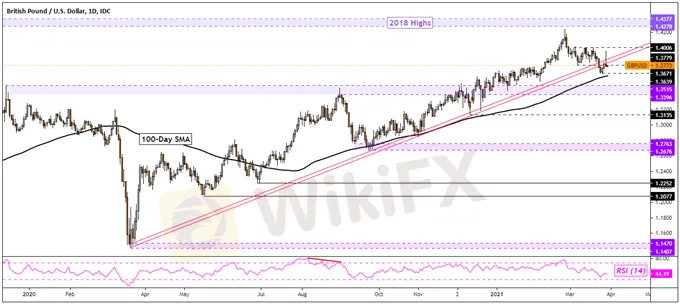 The British Pound could be vulnerable to the US Dollar in the near-term after GBP/USD broke under key rising support from March 2020. However, follow-through has been somewhat lackluster. As such, this places the focus on the 100-day Simple Moving Average to see if it holds as the next critical point of support. Taking it out would expose the 1.3515 – 1.3396 inflection zone. Otherwise, a push higher places the focus on 1.4006 followed by peaks from 2018.