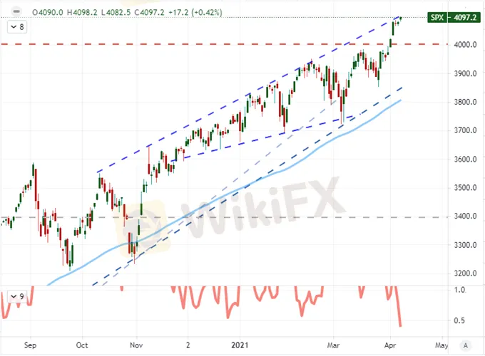 As expected, the S&P 500 managed to force a breakout this past session. What‘s more, the technical event tagged a fresh record high for one of my preferred ’risk‘ measures. If that were all we knew, we could draw some seriously enthusiastic conclusions about the state of the market. Yet, when we evaluate the situation from the chart and consider the disconnect from the heavy fundamental seas this week, the picture is rouses more concern over what’s ahead than the fact that we are pushing a second consecutive record high day just shy of 4,097. That is because the occasion of the break results in an extremely restricted (0.4 percent) advance with just as little active range as the preceding two sessions. Overall, the three-day activity levels (ATR as a percentage of spot) is still the lowest since holidays 2019 and really only comparable to the extreme quiet back in 2017. Further, this is the market picture we are presented with the back of a week that has been loaded with news of nearly a million added jobs in NFPs, the service sector running at a record pace, the IMFs growth outlook at a pace not seen since 1984 and a vaccination program well ahead of the ambitious objective.