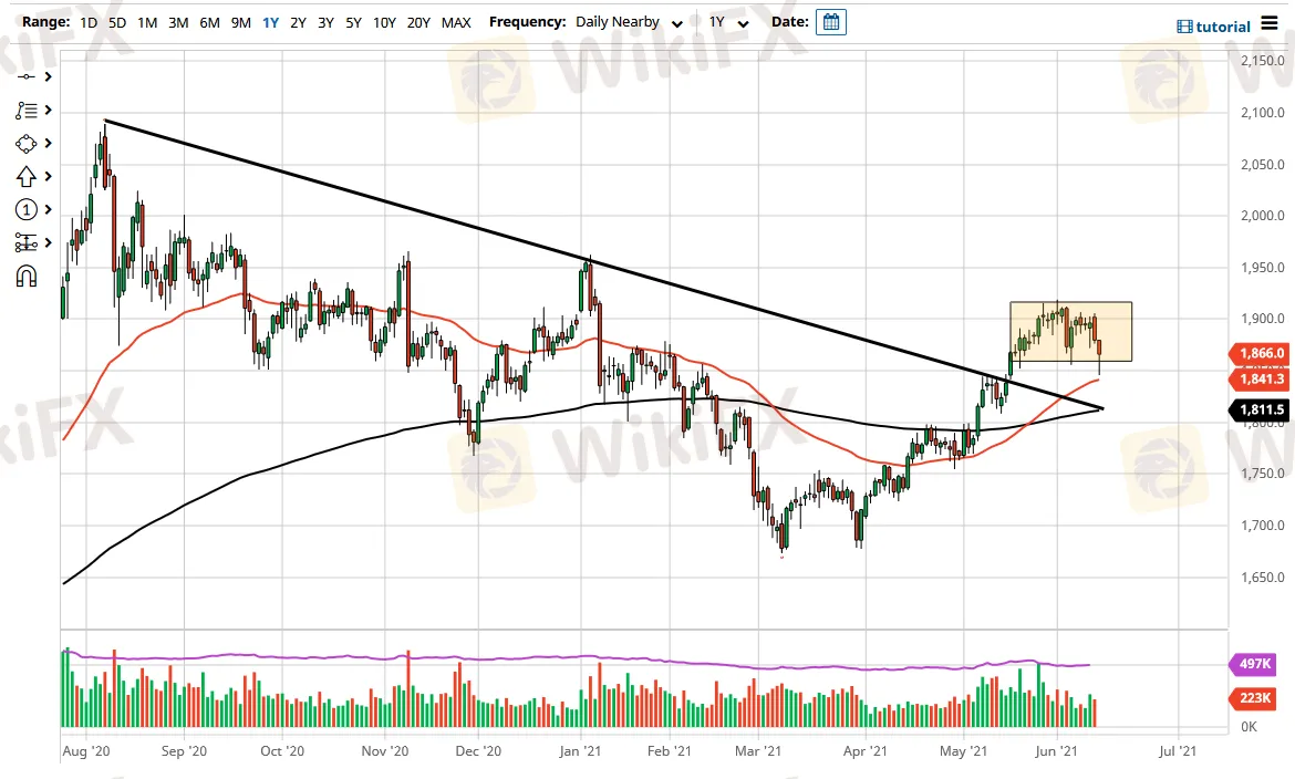 On the downside, if we were to break down below the range for the trading session on Wednesday, it could open up fresh selling. At that point, it is very likely that gold would get sold off quite drastically, with an eye on the $1850 level. That area will potentially be supported not only by the previous action that we had seen but by the 200 Day EMA as well. The market will continue to be very noisy, based on the bond market, and of course the US dollar. There are a whole host of issues out there that could come into the picture, not the least of which will be concerned with global growth and inflation.