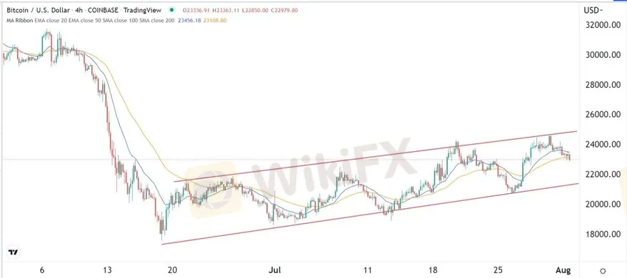The BTC/USD price pulled back during the American and Asian sessions as the recent spectacular rally faded. Bitcoin dropped to a low of $22,800, which was the lowest level since July 28th of this year. It has fallen by about 7% from its highest point in July