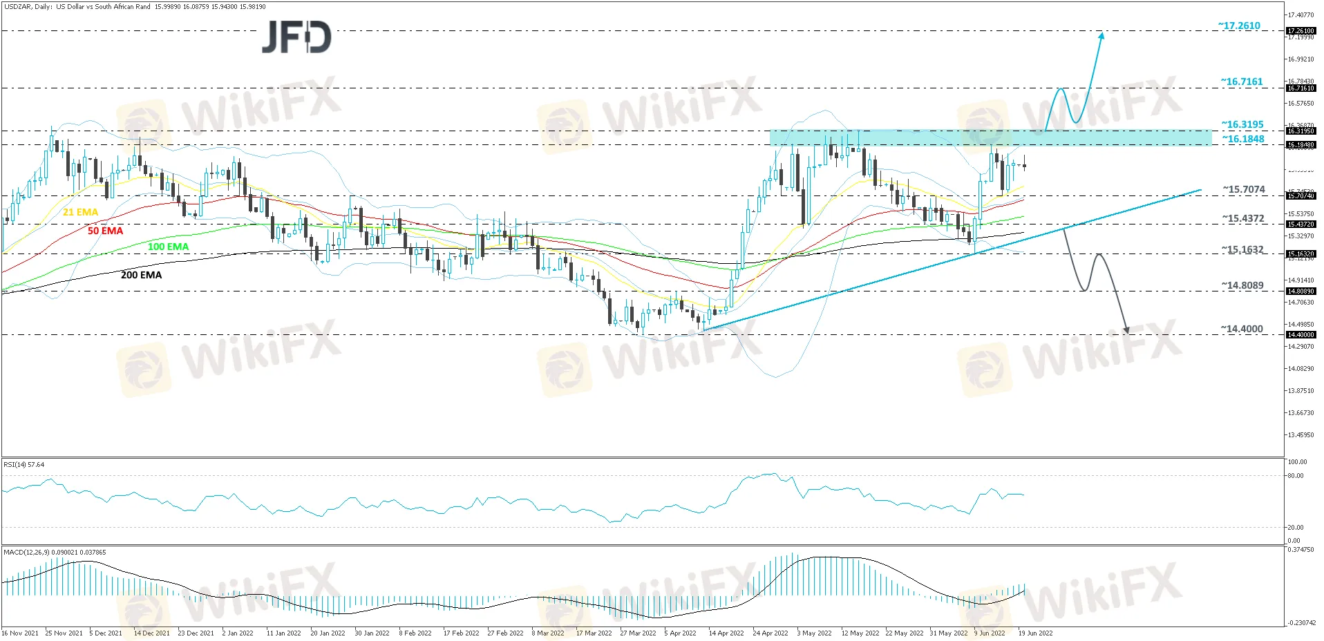 Abstract:Looking at the technical picture of USD/ZAR on our daily chart, we can see that after reversing higher at the end of March, the pair is now trading above a short-term upside support line taken from the low of April 13th. That said, the rate is currently trading below a key resistance area between the 16.1848 and 16.3195 levels, marked by the highs of June 13th and May 16th respectively. In order to aim further north, we would prefer to wait for a push above that resistance area first.