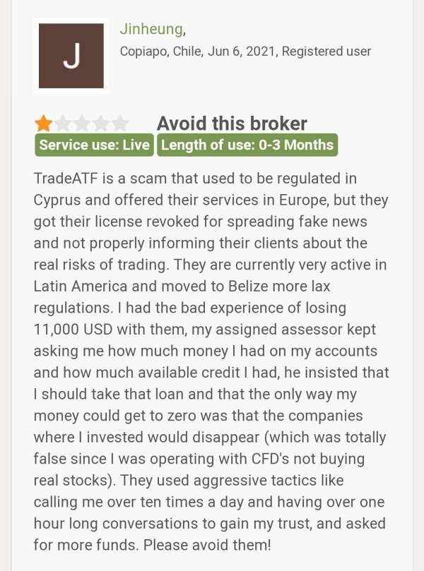 A client of TradeATF has lost a lot of money from his account and he claims this broker used to aggressively ask him to invest more money before he lost a sum of $11000. The client also informs, this broker had its license revoked in Cyprus for unethical practices.