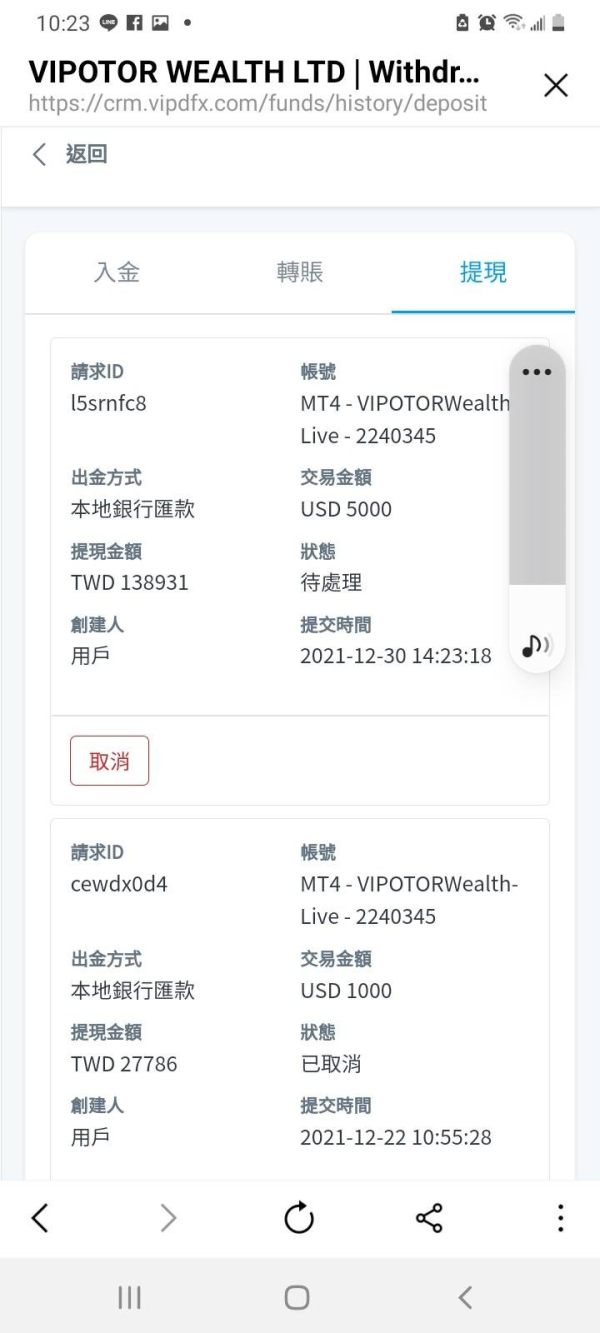 出金...說涉及洗錢法.要繳交20%保證金才能不凍結帳戶、開始真相信不得已下去借貸繳了,後又推說匯兌商為避稅被請去喝茶,各種理由推託不出金。後面全部錢都沒了說是系統遭黑天鵝攻擊後只一天戶頭錢變全空。還要繳50% 到70%錢才能回補給妳...相信嗎。全部積蓄及借來繳的保證金都騙騙騙、害人慘慘慘[D83D][DE2D][D83D][DE2D]、怎活下去阿、怎能這麼可惡.......、 希望不要再有人被騙了。