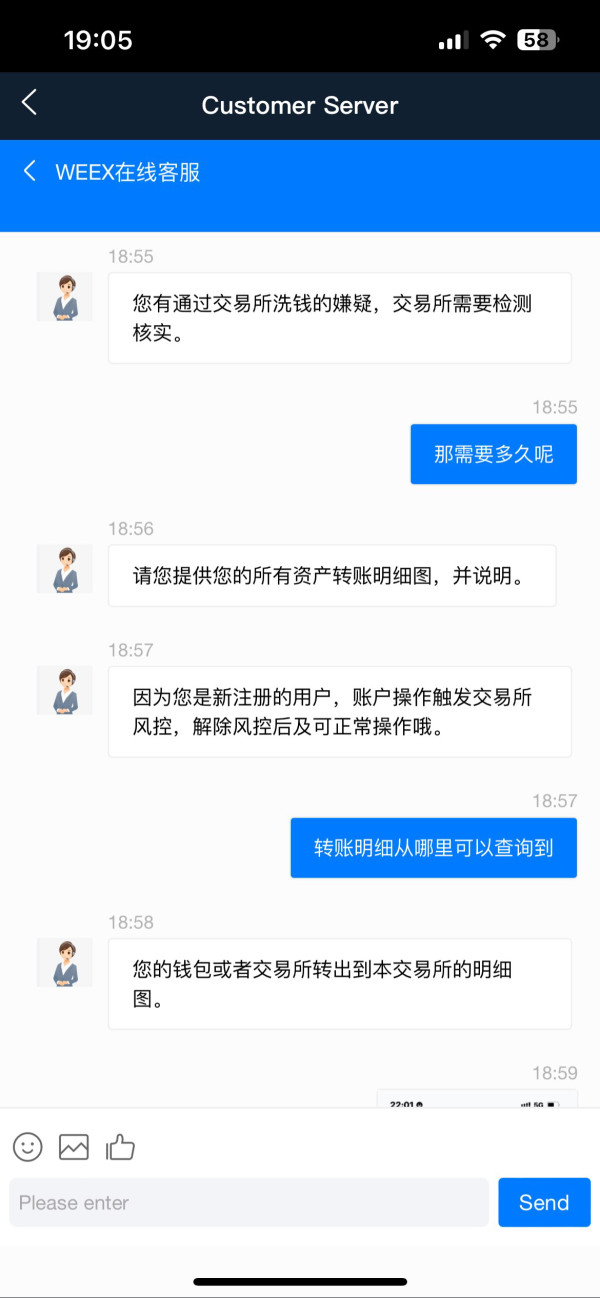 weex平台无法正常提现,第一次提现未成功询问客服,客服回答有两笔资金是由别人账户转于我,账户触发风控,涉嫌洗钱行为,需缴纳两笔资金的20% 来解除风控。后多次提现,未成功,询问客服,客服回答必须要交易够本金的100% 才能达到提现要求。