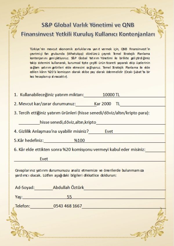 Yatırım danışmanı olarak whatsapp üzerinden 5074021953 telefonuyla Zeynep Demir 11 ekim 2024 te iletişime geçti. Kendisinin Temel Güzeloğlu Beyin asistanı olduğunu söyledi. Sonra beni M2 QNB BORSA HABER HIZLI SERVİS isimli guruba aktardı(gurubu oluşturan 05054157704). gurup yöneticisi,QNB yönetim kurul üyesi : Temel Güzeloğlu (05549752073) asistan :Zeynep demir;05073355927 .gurupta Temel Bey günlük hisse alım-satım yapıp katılanlara kar veriyordu. Zeynep Demir SPGLOBAL VARLIK YÖNETİMİ ve QNB FİNANSİNVEST adlı şirkete üye yaptı. İnternetten SPG PROGRAMINI indirmemi söyledi . kimlik fotoğrafımı aldı üye oldun dedi. SPK denetim belgesi gönderdiler 30,10.2024tenitibaren 95000TL yatırdım. Aselsan hisse artırımında destek olacaklarını söyleyip hesapta ek para görünmesini sağladılar. işlem sonucu ek paranın hesabımdan geri alınmasını istedim. kabul etmediler. dışardan verilecek hesaba para yatırmamı iste diler. sonrada iletişimi kesip hesabı kapattılar.