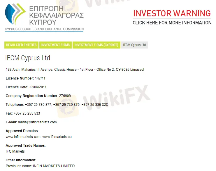 A pesar de que la jurisdicción es extraterritorial, por lo que siempre recomendamos tener precaución debido a su falta de control sobre las empresas financieras, IFC Markets incorporó una entidad adicional, IFCM CYPRUS LIMITED, una empresa de inversión de Chipre registrada bajo la regulación de CySEC.