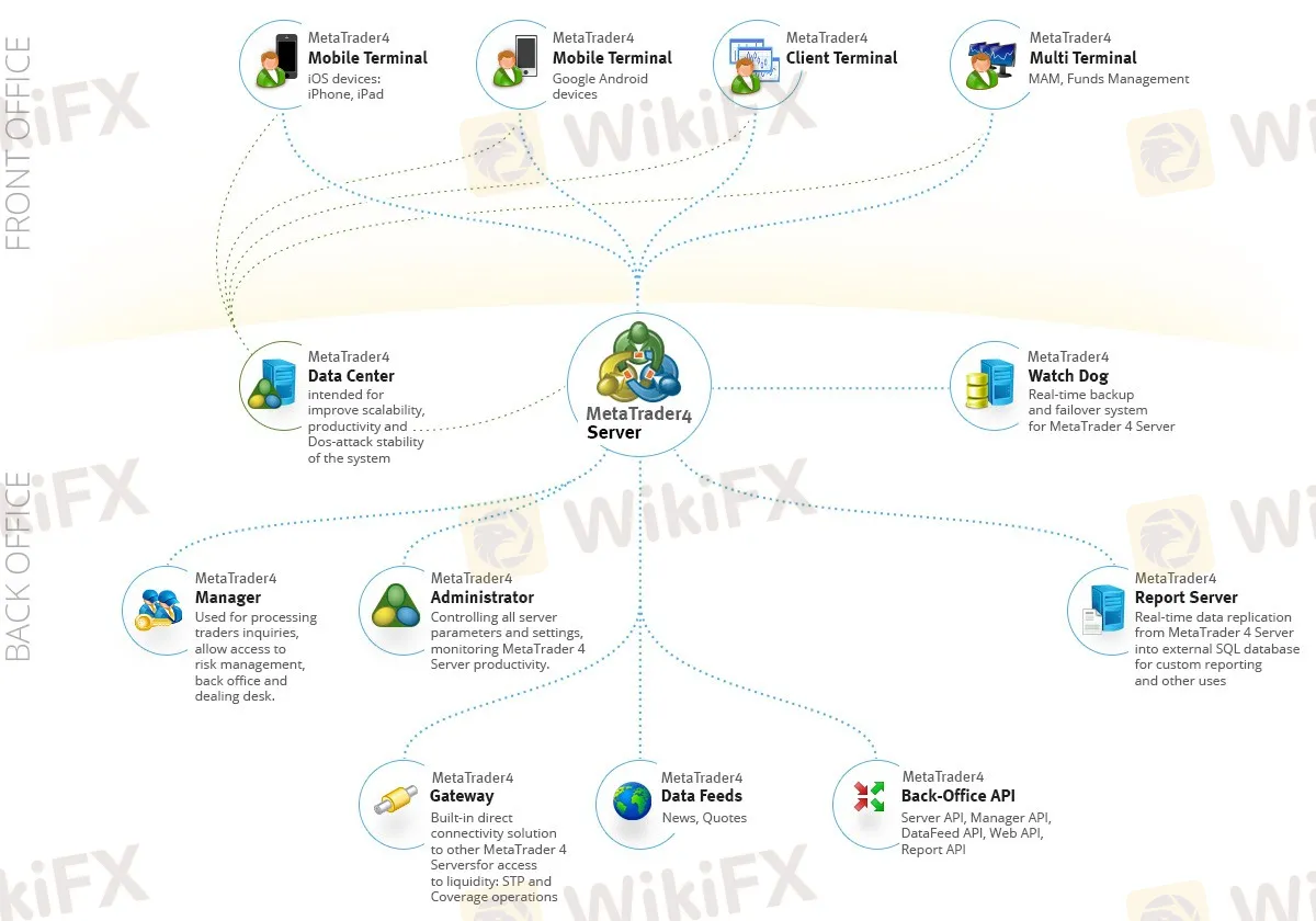 MetaTrader ofrece plataformas de escritorio, web y móviles . Las plataformas admiten más de 30 idiomas, incluidos inglés, francés, español, portugués, japonés, chino y ruso. La plataforma de escritorio ayuda a analizar los mercados financieros, realiza operaciones comerciales avanzadas, ejecuta robots comerciales y copia operaciones.