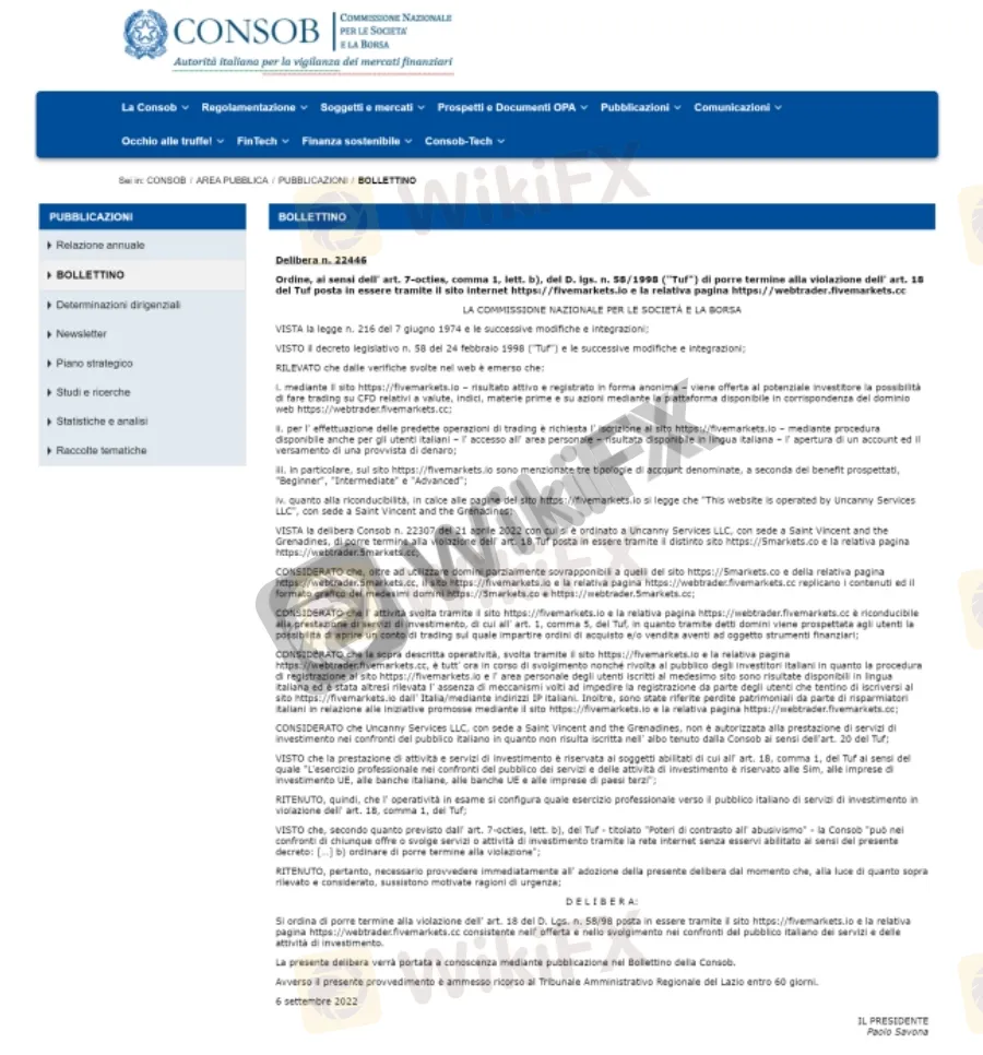 CONSOB cree que las acciones antes mencionadas a través del sitio web https://fivemarkets.io y la página web relacionada https://webtrader.fivemarkets.cc aún están en progreso, considerando que Uncanny Services LLC, con su oficina en St. Vincent y las Granadinas, no ha obtenido la Autorización para prestar servicios de inversión al público italiano, ordenar la terminación de las infracciones.