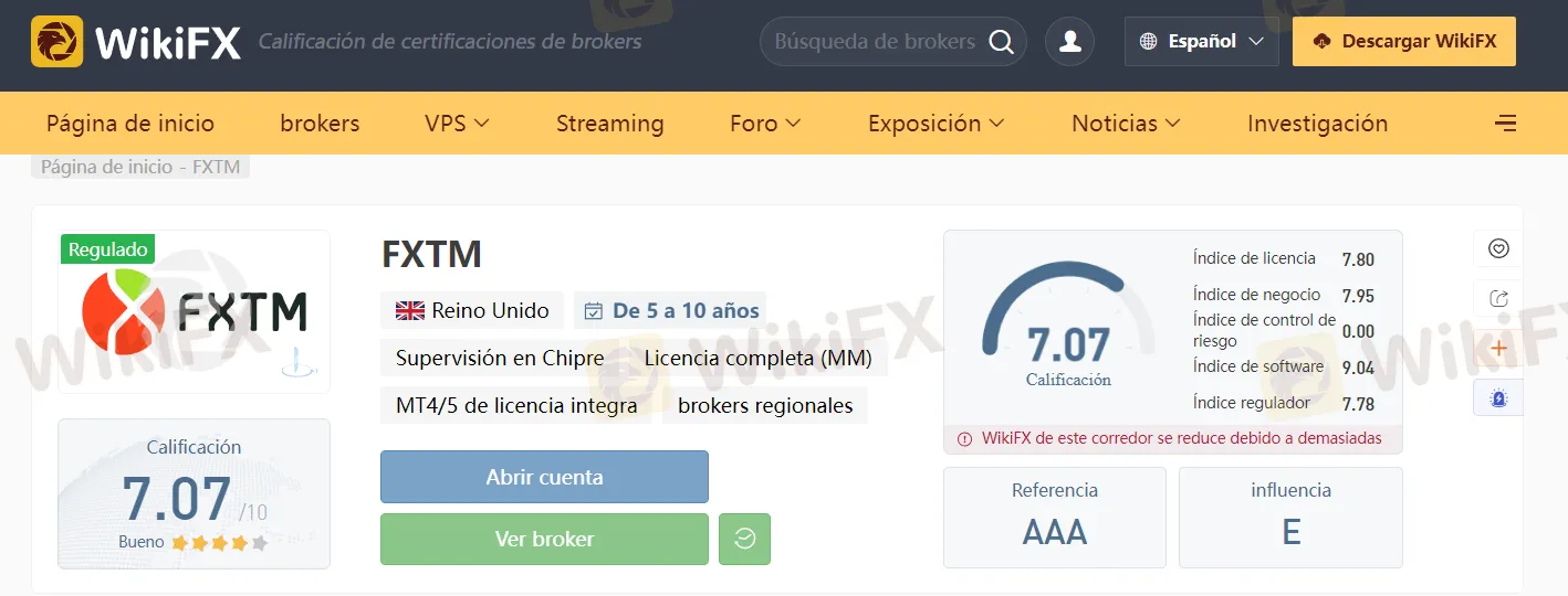 Es importante conocer si un bróker se encuentra regulado y por qué organismos, esto se puede consultar en las noticias de WikiFX, donde observamos que la calificación dada a este bróker es de 7.07 /10, lo que, aunque continua en la categoría de bueno, tiende a la baja, esto se debe a que en los últimos 3 meses, WikiFX ha recibido 27 denuncias de los usuarios sobre FXTM, lo cual es una señal de alerta, tiene tasas de retiro interno y una tasa de inactividad alta y además la licencia reguladora sostenida Sudáfrica FSCA (número de regulación: 46614) National Futures Association-UNFX supera el alcance de la operación, por lo que si va a realizar operaciones a través de esta filial debe tener cuidado.