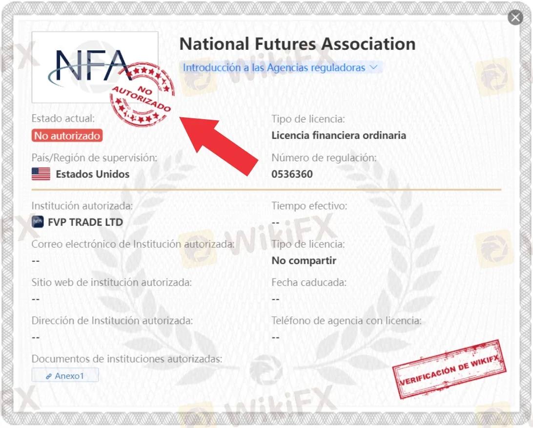 Se ha podido verificar que FVP Trade es ilegal, ya que toda su supervisión ha sido caducada. La supervisión de Estados Unidos NFA (Número de supervisión: 0536360) se encuentra como No autorizado y supera el alcance de la operación. La licencia reguladora sostenida del Reino Unido FCA (número de regulación: 956489) supera el alcance de la operación, y la supervisión de la ASIC (número de regulación: 001289584) está bajo sospecha de uso de licencia clonada.