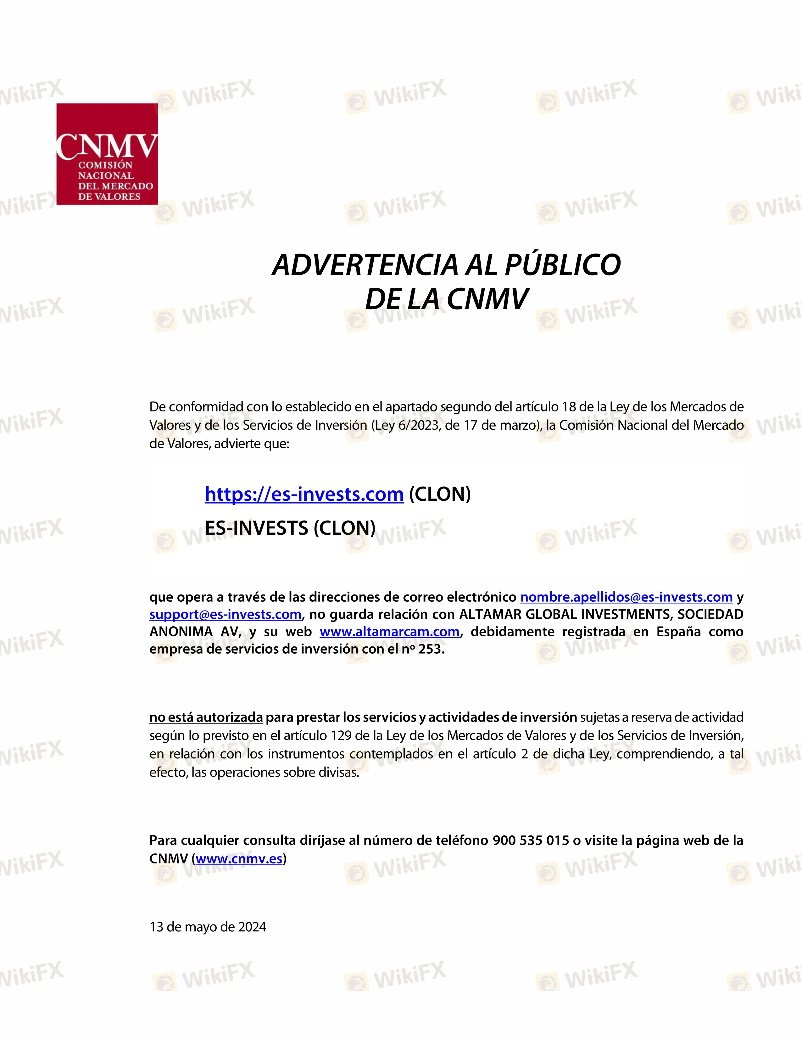 Extracto:La Comisión Nacional del Mercado de Valores (CNMV) ha emitido recientemente una advertencia sobre un clon del broker ES-INVESTS. Esta entidad fraudulenta opera a través de las direcciones de correo electrónico nombre.apellidos@es-invests.com y support@es-invests.com, y no tiene ninguna relación con ALTAMAR GLOBAL INVESTMENTS, SOCIEDAD ANONIMA AV, que está debidamente registrada en España. Esta alerta subraya la importancia de verificar la autenticidad de los intermediarios financieros antes de realizar cualquier inversión.