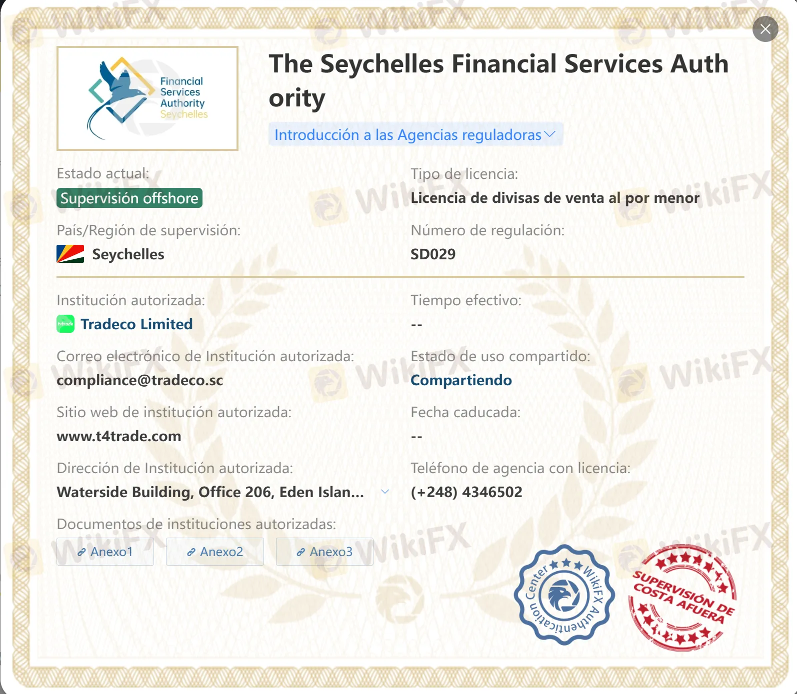 Sí. Seychelles FSA, entidad Tradeco Limited, licencia SD029 (Securities Dealer, jurisdicción offshore).