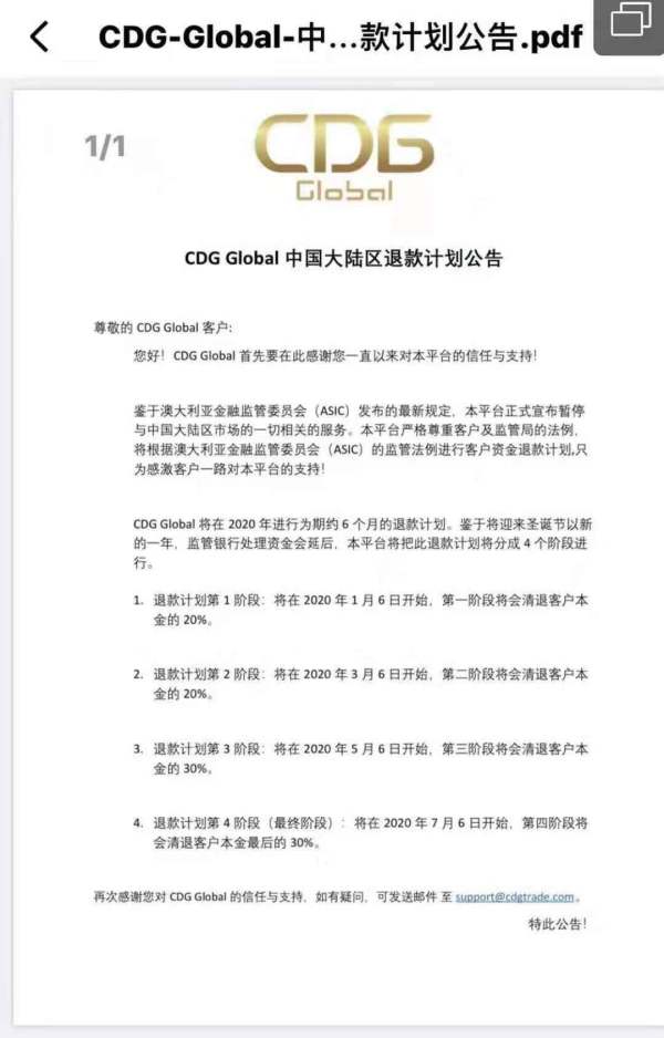 CDG Global在19年底,声称在中国大陆展开外汇服务违反澳大利亚相关法律规定而退出中国大陆区,并对客户的资金进行分批次清退。至今2020年4月还未收到退款。CDG公司在中国进行欺诈。希望有人能进行调查,帮助我们追回退款。