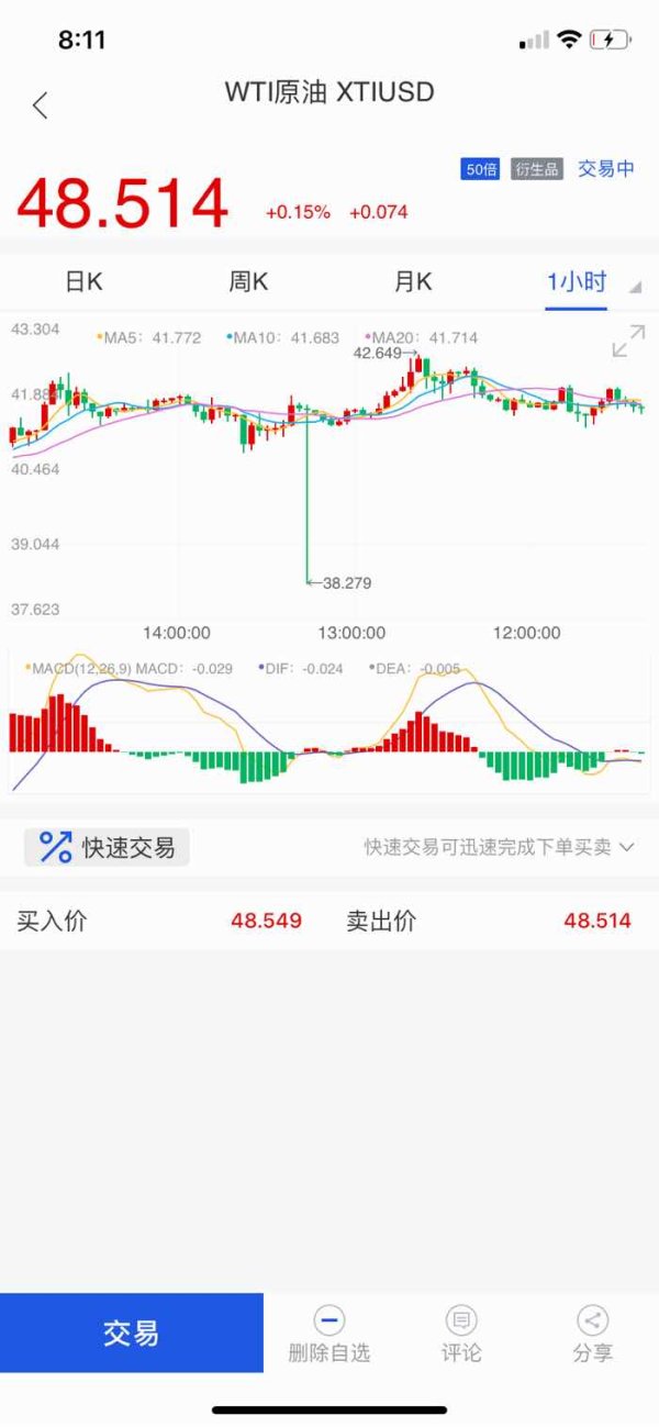 2020年11月18日凌晨5点30分到6点15之间出现了38.279的低位,醒了之后发现我被打爆了。但是,在另一个平台和我一样持有相同多单的盆友单子正常,并一直拿着止赢离场。我去查了那天的国际油价,并没有发现出现这么低的价格。希望众多投资者擦亮眼睛,远离陷阱。