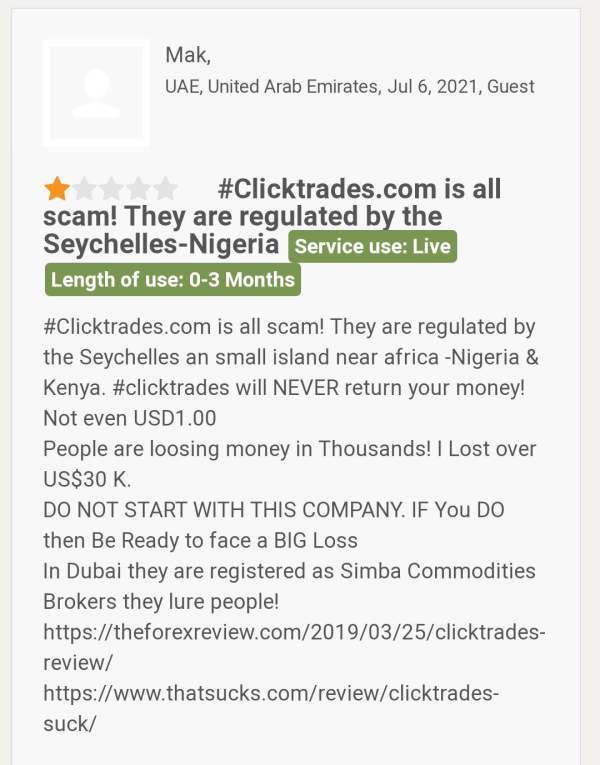 A client has lost $30k in clicktrades. He has claimed if people invest in clicktrades they will lose their money.