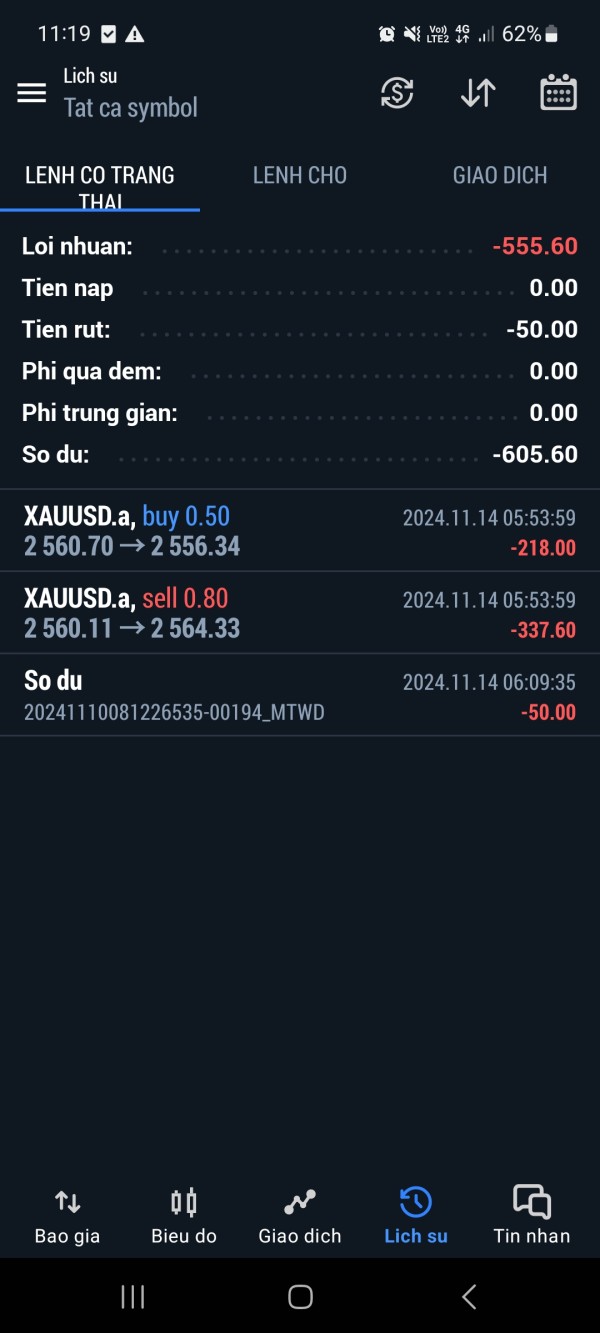 Yêu cầu bên sàn làm rõ vấn đề lúc đầu bắt người chơi nạp rất nhiều lần..khi nạp lên gần 1k4 thì dc bonus ..khi người chơi hk rút vốn rhif bên kia là tấn sơn yêu cầu thựcđur 3.6lot ..và khi làm đủ 3.6lot vẫn hk rút đc..bên kia báo. Là chuyển vào tài khoản khác...tôi vẫn chấp nhận chịu lỗ và muốn rút voins còn lại..thì bên kia là tấn sơn..yêu cầu tôi đánh 1 lệnh là 1lot buy.. và 1 lot sell.. thì làm theo hướng dẩn..và cắt lệnh nào âm..sau đó đánh thêm 1 lệnh nào xanh để gỡ vốn lại..thì lặp tức giá chênh lệch gần 800u làm tôi cháy hết tài khoản còn có 89u...khi hỏi tại sao thì thằng tấn sơn im..và thu hồi hết tất tin nhắn mà nó yêu cầu tôi thực hiện..mong có lời giải đáp..từ bên sàn IVY này