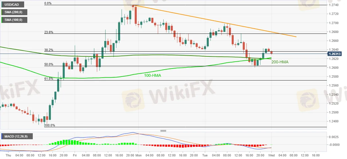 Ang USD/CAD ay lumalabo ang pagtalbog sa mga lingguhang mga pagbaba habang kumakalma sa 1.2630 sa panahon ng Wednesday Asian session. Sa pamamagitan nito, ang quote ay naghihirap sa maagang paggalaw ng pag-recover ng Asia ngunit nananatili sa itaas ng susi ng HMA na samantalang tinutukso ng MACD ang mga bulls.