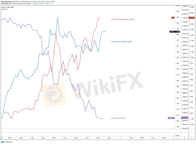 Ang mga stock ng US ay lumipat nang mas mababa habang ang ani ng Treasury ay may spiked, na tinutulak ang mga namumuhunan sa isang peligro na may peligro sa tech-mabigat na Nasdaq Composite na humahantong sa paglipat ng mas mababa, pagsara ng 2.72% sa araw. Ang Dow Jones Industrial Average ay nawala ang 0.38% habang ang S&P 500 ay nagsara ng 1.30% sa pula. Ang mga stock ng maliit na cap ay nagdusa din at ang VIX volatility index ay umakyat ng halos 10%.