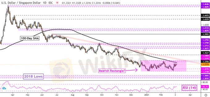 Ang Singapore Dollar ay patuloy na nakikipagkalakalan sa loob ng isang pattern ng tsart na 'Bearish Rectangle' laban sa US Dollar. Ang 100-araw na Simple Moving Average (SMA) ay papasok din sa pagtuon, kumikilos bilang paglaban. Iyon ay maaaring presyon ng USD / SGD na mas mababa sa loob ng mga limitasyon ng rektanggulo para sa isa pang pagkakataon na kumuha ng suporta na isang saklaw sa pagitan ng 1.3158 - 1.3215. Ang paglabas ng zone na ito ay naglalantad ng mga pagbaba mula sa 2018. Ang kisame ng parihaba ay tila isang saklaw sa pagitan ng 1.3375 - 1.3404. Sa itaas ito ay bumabagsak na pagtutol mula Hunyo - tingnan ang tsart sa ibaba.