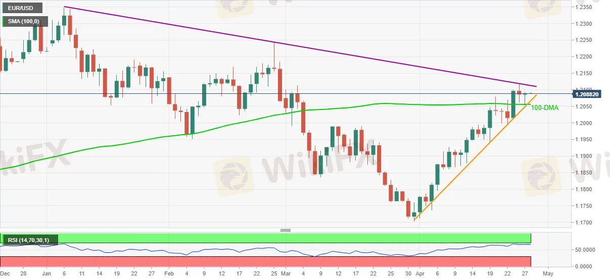 Balita sa Forex ng WikiFX (Ika-28 ng Abril taong 2021) - Pagsusuri sa Presyo ng EUR/USD : Pinapanatili ang pag-bounce ng 100-araw na SMA sa araw ng Fed.