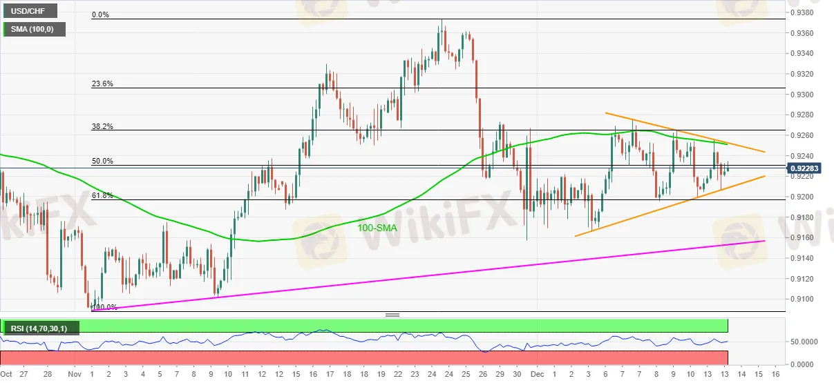 Ang USD/CHF ay nananatiling banayad na nag-bid sa paligid ng 0.9230, na pinapanatili ang mga paggalaw ng pagbawi noong Lunes sa unang bahagi ng Martes sa loob ng isang linggong gulang na symmetrical triangle formation.