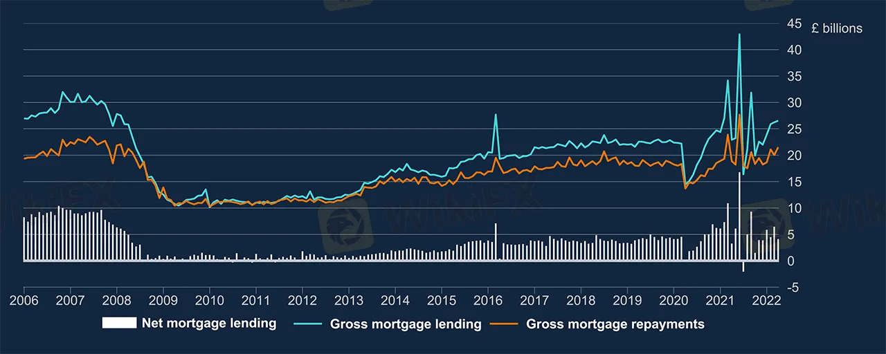 Ang netong paghiram ng utang sa mortgage ng mga indibidwal ay bumaba sa £4.1 bilyon noong Abril, bumaba mula sa £6.4 bilyon noong Marso. Ang mga pag-apruba sa mortgage para sa mga pagbili ng bahay ay bumaba din sa 66,000 noong Abril mula sa 69,500 noong Marso. Ang parehong mga hakbang ay bahagyang mas mababa sa kanilang 12 buwang pre-pandemic na average hanggang Pebrero 2020.