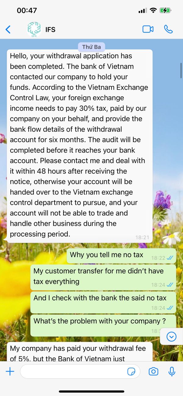 我取钱300,000 USD 出来说我账号frozen 叫我放进去300,000 USD我才能出来取钱出来,我就放进去,我问过他还有什么问题吗? 有税吗? 他就说不用担心,没有税,让我取钱第二次(第一次说frozen 8月才能处理好)跪了几天跟我说税高让我放进去90,000 USD(时间给了48 个小时处理,不处理说了会出很多问题,我账号不能动,我账号里面1.100.000 USD + 300,000 USD frozen = 1,400,000 USD ) 过一两天钱可以到我这里银行,到了今天发短信给我说了我是国外投资是洗钱,现在我全部账号frozen 等他们处理,有一次48个小时我没钱处理我朋友用他账号保证,现在也要把我朋友账号吃掉,frozen 我朋友账号6.,000,000 USD ( 六百多万美元) 说保证过我账号(说我们不同国家,两个洗钱)他们每次看到我们要取钱,他们多说各种理由让你钱放进去一次吃到你没钱才行,叫他们证明一些东西,都说他们责任只是告诉我们处理这些事,那些认证的资料他们不能发,根本他们没有帮我们取钱, 要告诉大家不要信任他们这家 IFS Markets