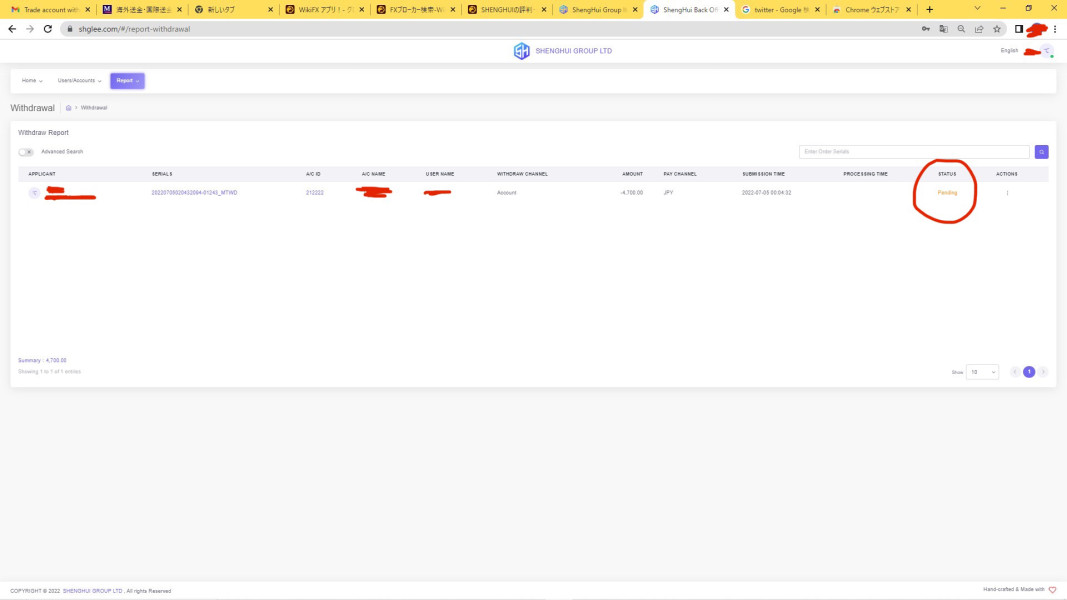 6月30日のボーナスキャンペーン終了後、日本語のサポート LINE:FX-Shenghui とコンタクトができなくなりました。 トークを送っても、既読もつきません。 そのような中、出金依頼をしましたが、出金拒否のメールがきました。 理由もないです。 HELP LINE にトークしても、何も返信ありません。 納得できません。 全額とは言わなくても、入金した分は出金させてください。