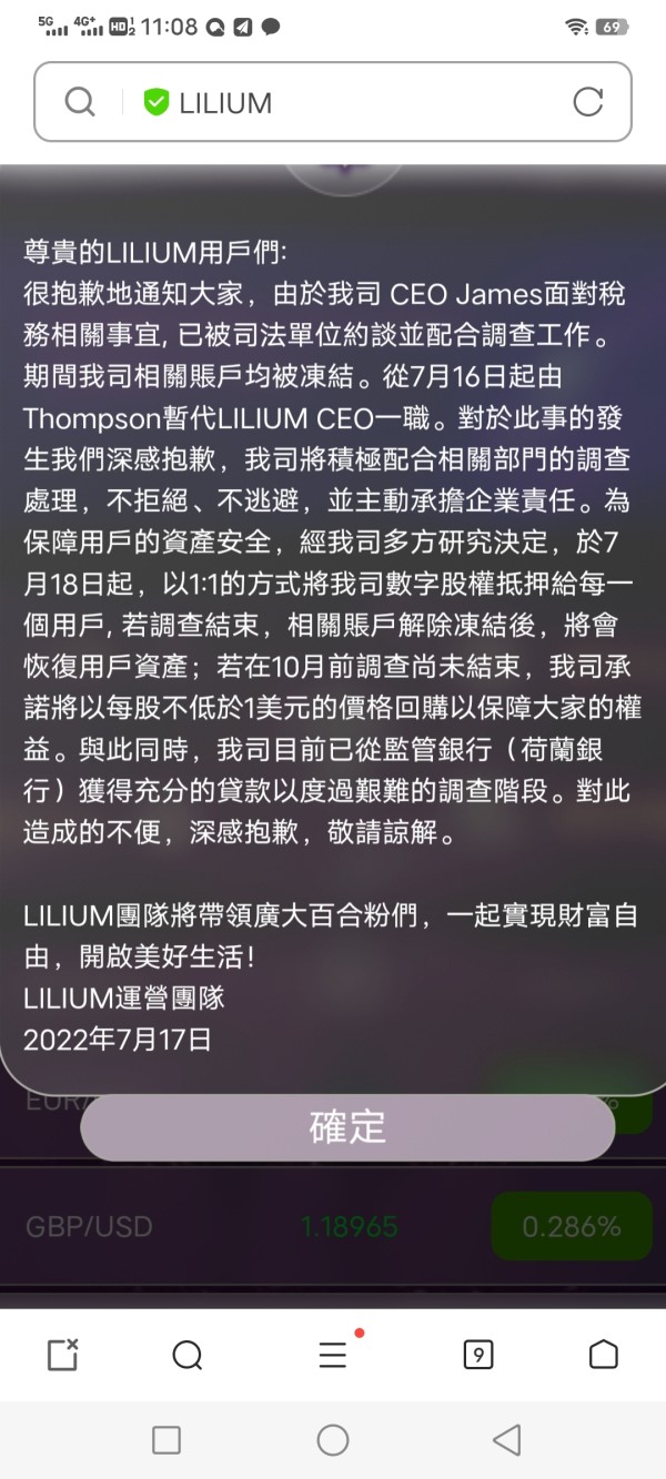 今天百合外汇平台出了新公告,称其公司总裁因涉嫌税务问题被调查,公司账户资产被冻结。现平台已无法出金!只是给予会员数字股权的承诺,疑似在拖延时间!