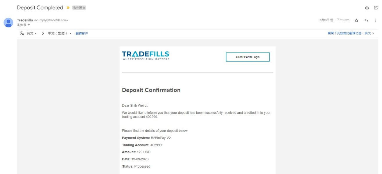 本人於2023/03/13註冊 Tradefills 平台交易帳戶並透過USDT-TRC20入金129 USD(如附圖),之後於2023/03/16申請透過USDT-TRC20出金113.96 USD(如附圖),TradeFills於2023/03/17通過我的出金申請,但是我並沒有收到款項,後續寫信給客服沒有得到任何回信(如附圖),2023/03/24平台將我的客戶端後台關閉無法登入,2023/04/06TradeFills官網https://www.tradefills.com/已經無法進入了且客服信箱support@tradefills.com也無法接收信件了