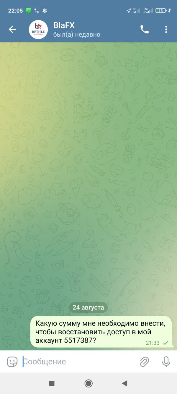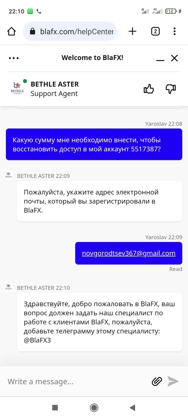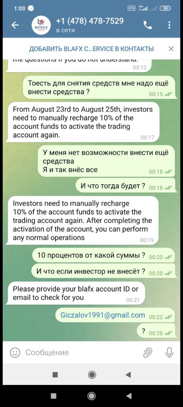 Я не могу вывести свои деньги с BlaFX! Система заблокировала возможность отписки от трейдера. А проблема заключается в том, что пока аккаунт подписан на трейдера, невозможно оформить вывод средств! BlaFX уже как неделю не выводит средства! В итоге я не могу вывести $31.952,5! Более того BlaFX стал требовать оплаты 15% депозита от текущего баланса за активацию уже действующего аккаунта! Также официальный аккаунт BlaFX в Telegram не отвечает на мои сообщения!
