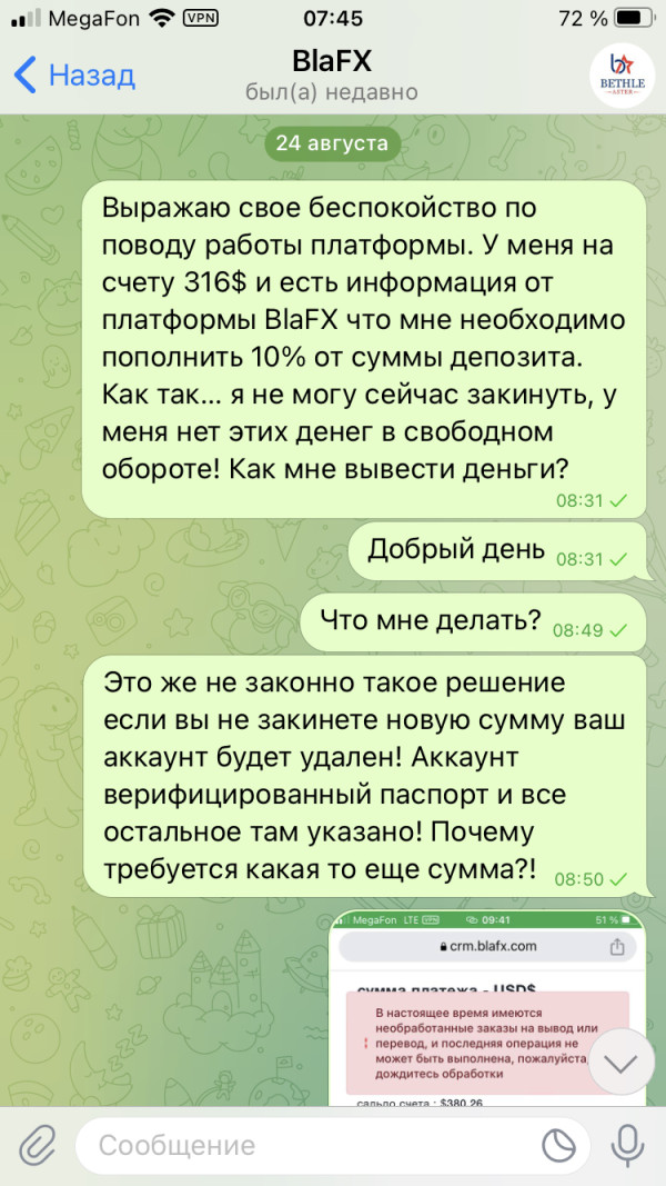 здравствуйте, меня зовут Дементьев Павел. Я являюсь инвестором платформы BlaFX. хочу сделать заявление о не возможном выведе моих денежных средств с с моего торгового счета. В настоящее время платформа заморозила все средства и любые операции по ним. служба поддержки ни чего не отвечает, и ни как не комментирует происходящее. другие инвесторы поделились информацией о том что необходимо пополнить 10% от суммы депозита и тогда счета разморозиться, и можно будет вывести деньги! Я внес 10% от депозита но ни чего не происходит! мои деньги на данный момент находиться на платформе. баланс моего счета 382.12$ Я искренне надеюсь на ваше вмешательство и скорую обратную связь. С уважением Дементьев Павел.