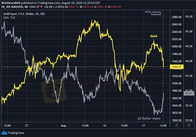 WikiFX News (jeudi 20 août 2020) - Le petit matin, la FED (Réserve Fédérale des Etats-Unis) a mis en œuvre de son procès-verbal, provoquant à l‘improviste la forte fluctuation du marché. L’indice USD a fortement augmenté alors que le prix de l‘or a chuté de 80$ US l’once troy.
