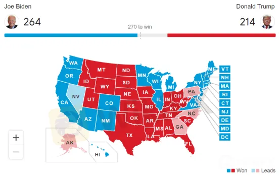 Selon les données les plus récentes, Biden a déjà obtenu 264 grands électeurs, alors que Trump en a obtenu 214. Pour l‘instant, il reste encore 5 états qui n’ont pas encore confirmé leurs résultats électoraux. Biden pourra donc accéder à la Maison Blanche s‘il y acquiert une victoire. Parmi eux, le dépouillement du Nevada est encore en cours. Selon un officiel électoral de cet état, le résultat du dépouillement ne sera actualisé que dans le matin du 5 novembre, à l’heure locale.