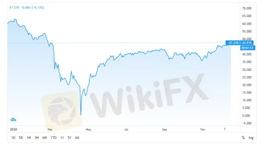 WikiFX News (mercredi 16 décembre 2020) - Mardi, le prix du baril du pétrole brut WTI a largement rebondi de 2%, jusqu‘au point haut journalier à 47,73$ US, grâce à de bonnes nouvelles sur le Brexit et le plan de relance financière. Ainsi, le marché a prévu que l’Opep+ pourrait ralentir la hausse de production pétrolière.