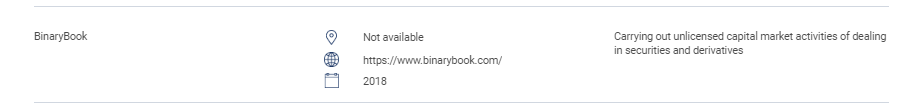 "cette section contient la liste des sites Web, des produits d'investissement, des entreprises et des particuliers non autorisés. cette liste comprend : les personnes exerçant ou se présentant comme exerçant les activités réglementées suivantes sans autorisation de la sc : négociation de valeurs ; négociation de produits dérivés ; gestion de fonds ; conseil en financement d'entreprise ; conseil en investissement ; planification financière ; et négoce de régimes de retraite privés. personnes exploitant un marché reconnu sans autorisation. personnes émettant ou offrant des valeurs mobilières sans approbation, autorisation ou reconnaissance. personnes utilisant à mauvais escient le logo de sc et dénaturant le sc. " BinaryBook non disponible https://www. BinaryBook .com/ 2018 exercer des activités non autorisées sur le marché des capitaux consistant à négocier des valeurs mobilières et des produits dérivés